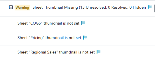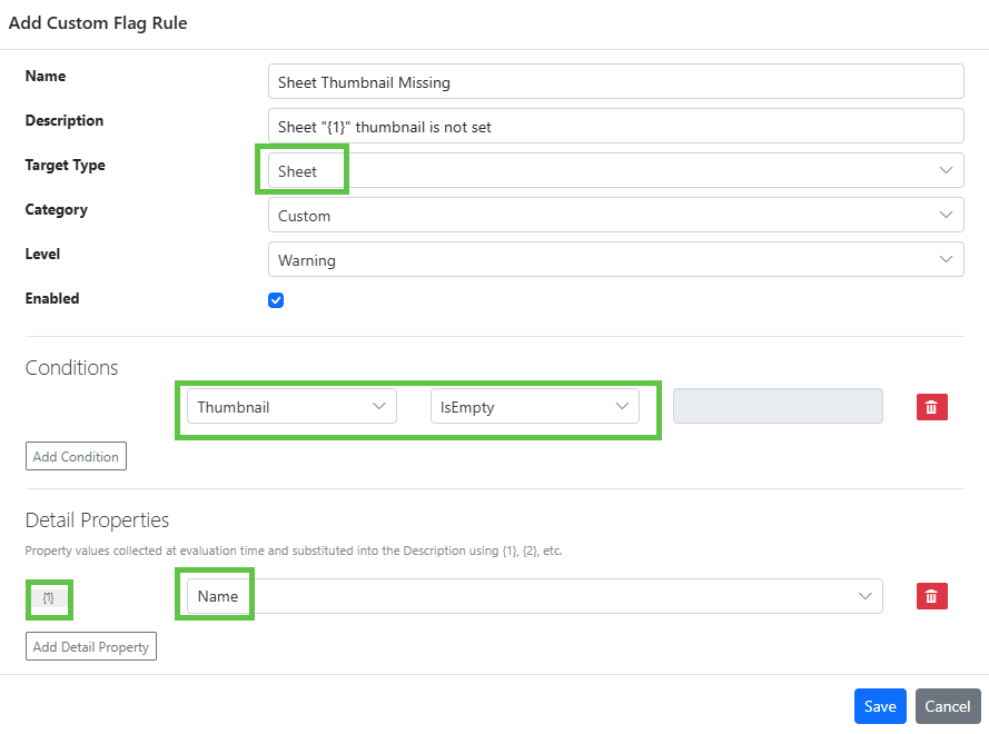 In the rule above, we define that every Sheet must have a thumbnail. When we select a Target Type of Sheet, properties of Sheet are made available in the Conditions and Detail Properties dropdowns. QSDA evaluates these conditions during analysis and raises the flag when they are met.